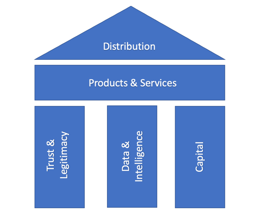 In its simplest form, banks exist on top of three fundamental foundations: trust and legitimacy, data and intelligence, and capital. Trust and legitimacy consists of the bank’s brand and public image (a bank must look secure and trustworthy, hence all the fancy suits and imposing buildings), and all its regulatory licenses. Data and intelligence used to be comprised of the bank’s employees and customer records, but in today’s world are rapidly being complemented (and sometimes replaced) by databases and algorithms. Finally, capital consists of all the funds that the bank is entrusted with from its customers, depositors and investors.